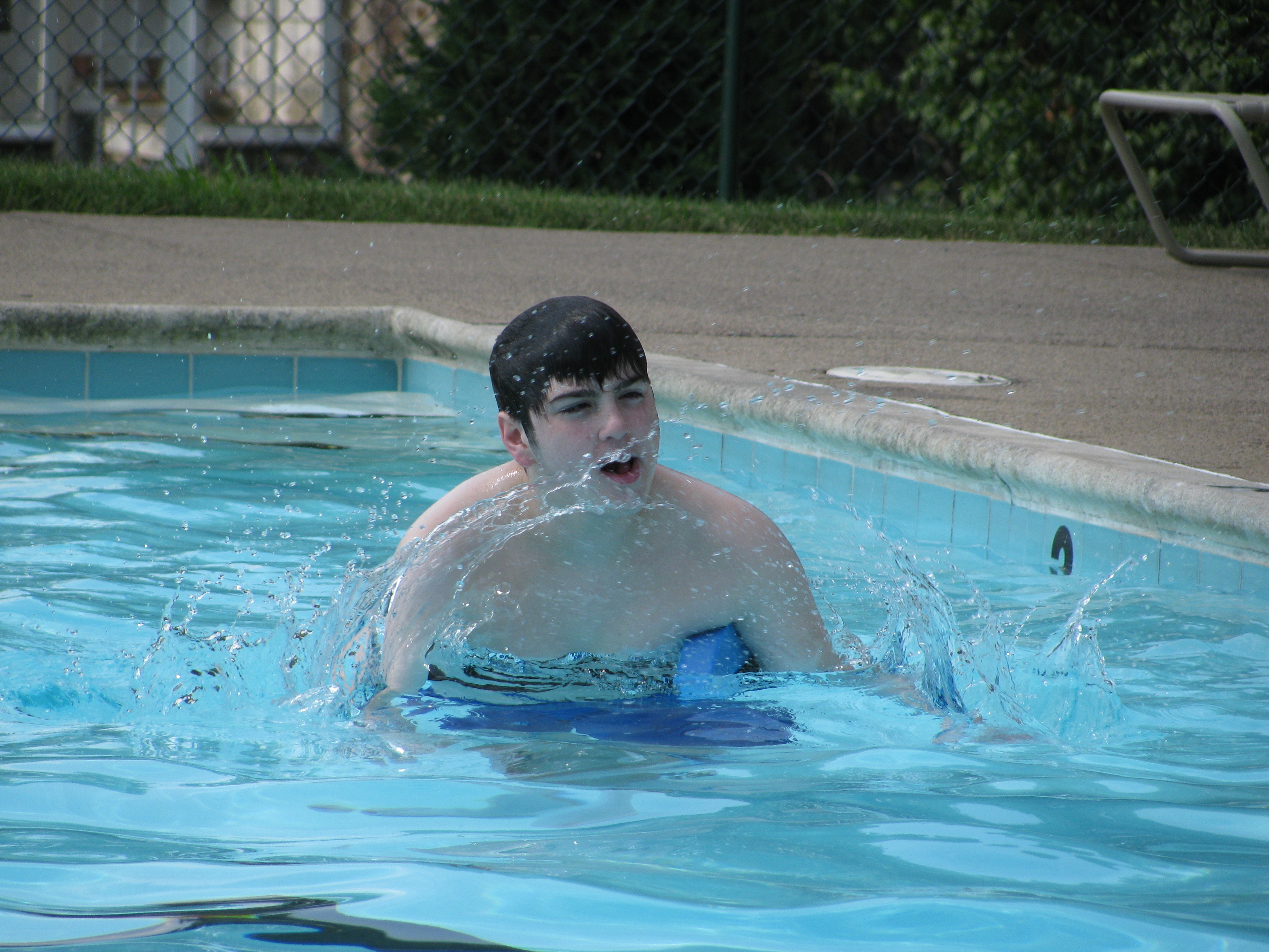 Clay splashingAbout 30 minutes later, the crowd began to swell. More heavily tanned seniors. More spoiled grandchildren splashing and whining. One elderly man who was swimming laps would stop to talk with Clay when he got to our end, holding his hands and jumping up and down with him. Everyone else kept their distance. A teen who had been lying in a lounge chair nearby when we arrived, surreptitiously moved back with her family. Clay had half of an Olympic size pool to himself, while about 10 or 15 people huddled at the other end. Inevitably, one gray-haired geezer standing in shallow water, whistled and yelled at Clay to keep it down. My wife was not pleased. This is a woman who I watched curse out a drunk standing in front of our car at midnight while we attempted an ill-advised short cut through an urban landscape that looked like Dresden after the bombing. My life flashed before me once again. I told her I would talk to the man, if it kept up. Mercifully, for him (and me), he didn’t make any more comments.