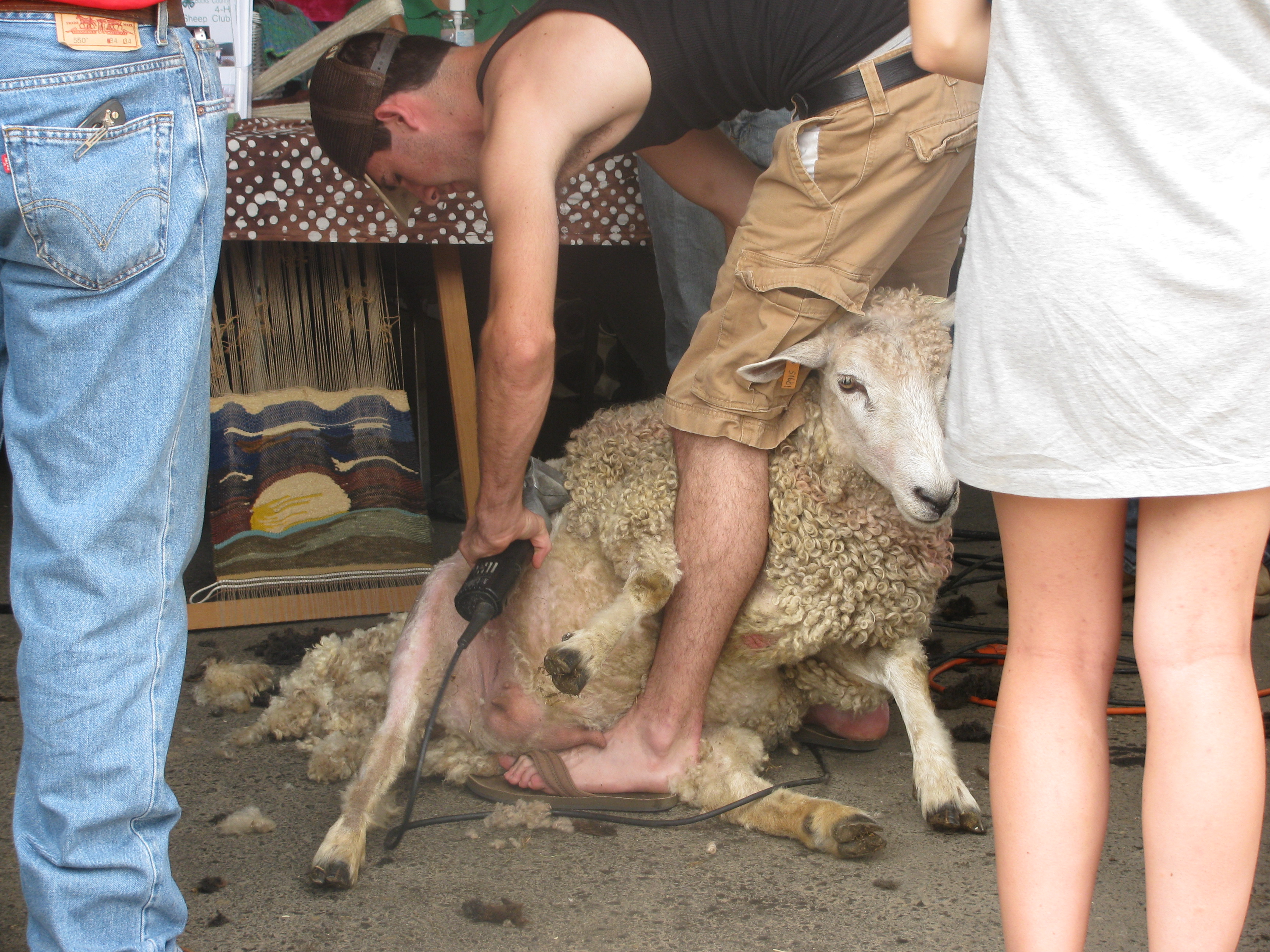 Then we saw a sheep being sheared. Reminded me a little of giving Clay a haircut. The sheep had the same expression Clay gets. But it was staying a lot more still.