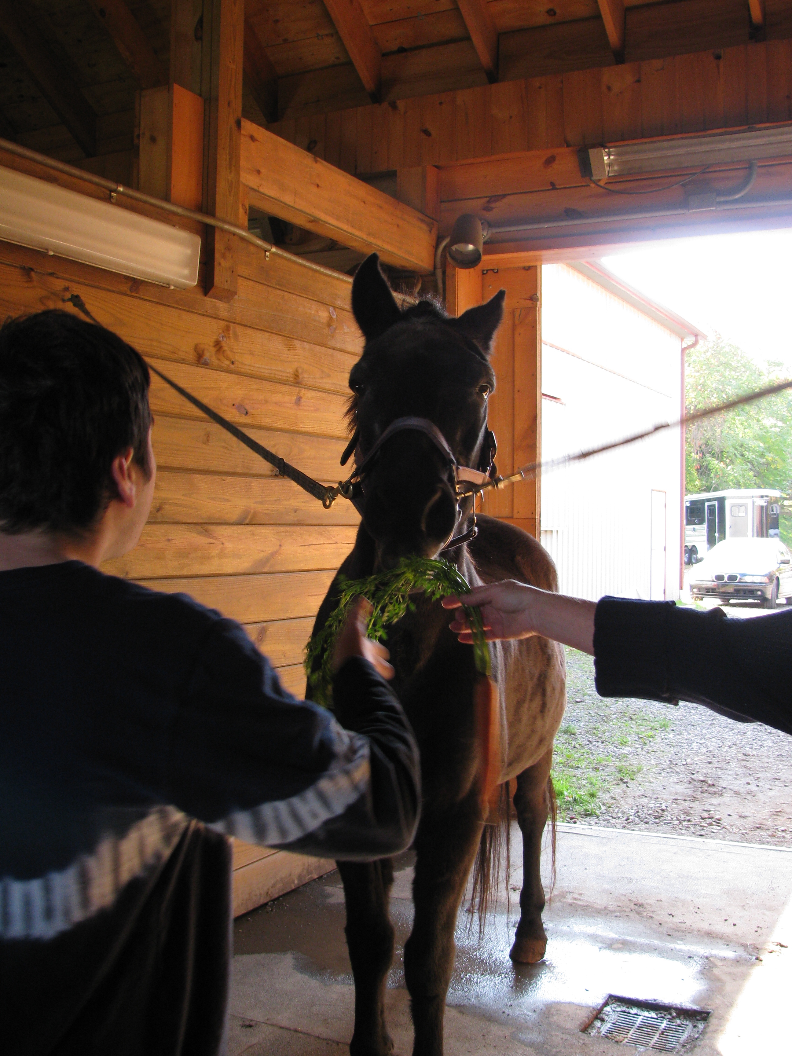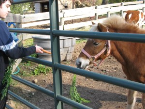 He was a little nervous about feeding carrots to the horses, but gradually got the knack of it.