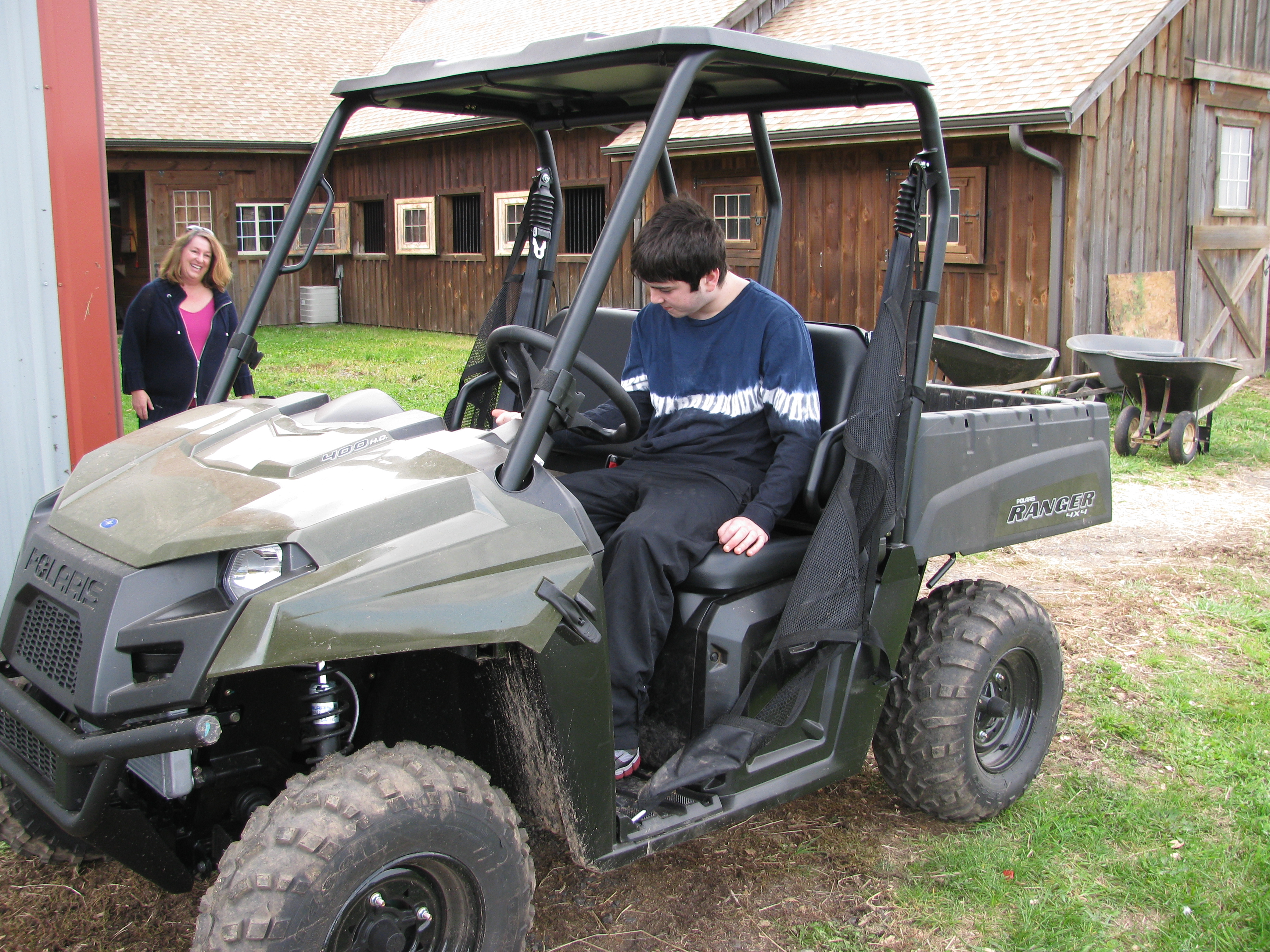 Back in the stables, we lost Clay for a few moments, but then found him sitting—where else—in a little utility vehicle. (His love of these is well documented.)