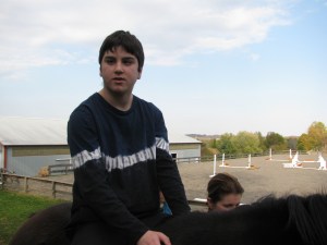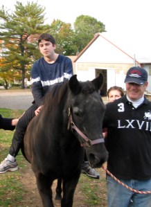 That’s when the question came up. Would Clay like to ride Rocky? Rocky was the gentlest horse there. The owners’ son had learned to ride on him. He was already Clay’s favorite. My wife and I didn’t think Clay was ready to climb on a horse that afternoon (he had sat on one briefly at camp last summer), but she asked him on the keyboard. His answer: