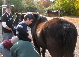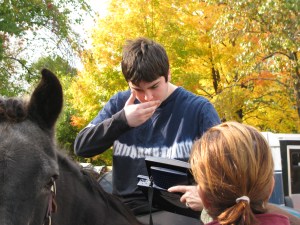 Then, for the first time on that visit, he became agitated. We worried that he had enough and the visit was over. But after several minutes of being upset, Clay finally typed, “So sad because of the electric fence.” We had told him not to touch the fence around the pen because it had an electric wire. Seems that he was worried that the horses would get hurt. The owner explained that the electric fence was there to protect the horses. Among other things, it prevented them from chewing on the wooden rails and choking on splinters. Clay eventually calmed down, and we wandered back into the stables to visit the other horses. There are 27 on the farm.