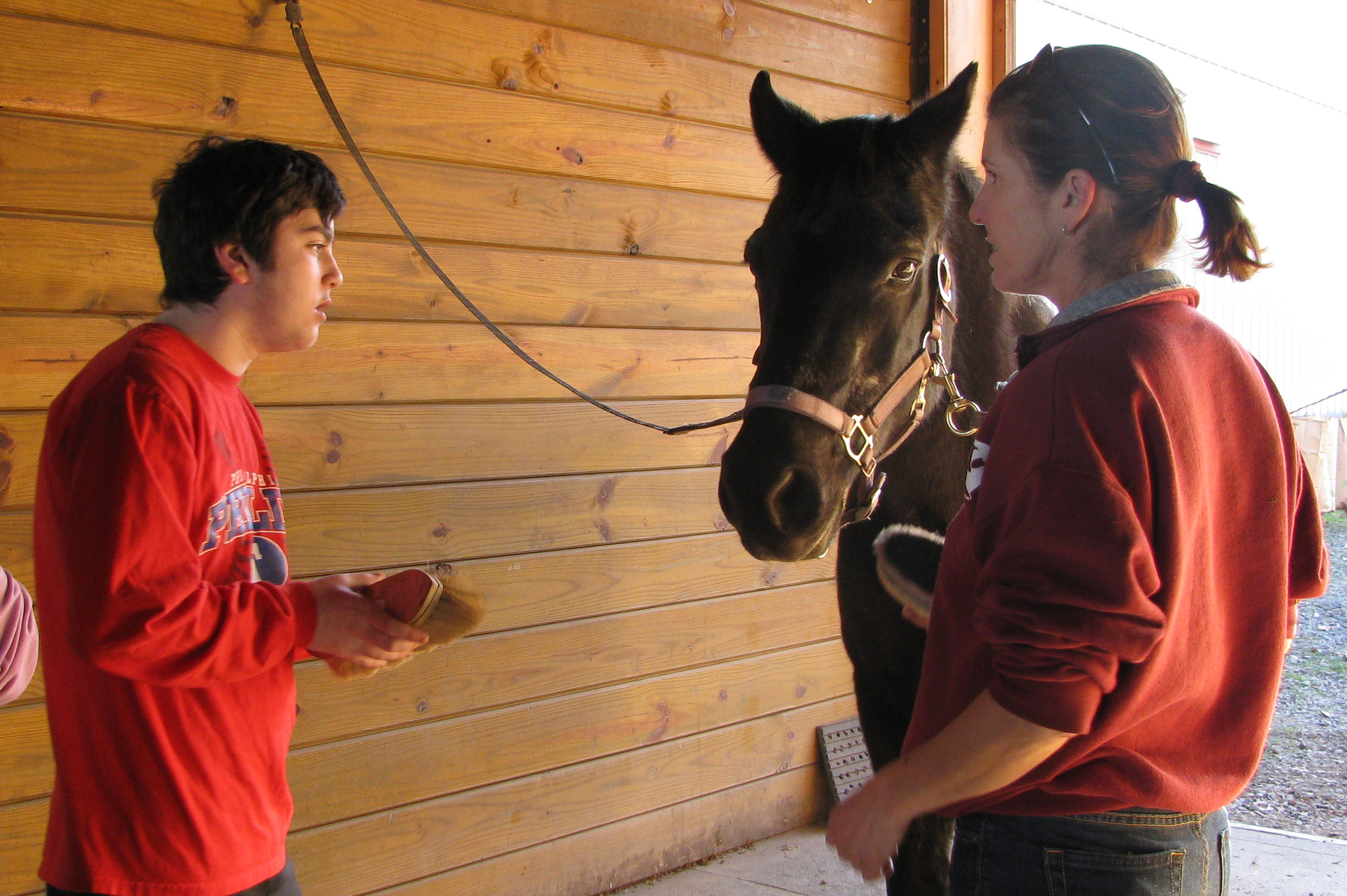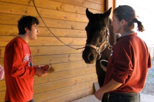 Clay started his lesson by learning to brush Rocky, comb his tail and dig the dirt out of his hooves.