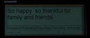 Having our older son home from college for the holiday. The chance to be with my family for Thanksgiving and to connect with our wider family over the phone and on the Web. That our old dog is out of pain and a our new one has found a home. For everyone who has helped on Clay’s journey out of the silence over the past year—family; afternoon sitters Stacey and Marissa; Kalil and other aides; camp counselor Trish; Jen, Joe and Jessica (the three J’s) at Networks for Training; Marilyn Chadwick of Syracuse University’s Institute on Communication and Inclusion; and his team at school, which agreed last week to begin training to get him typing in class. Of course, we are so thankful that Clay now has the opportunity to share his thoughts and feelings with us and all of the opportunities that will bring for him.