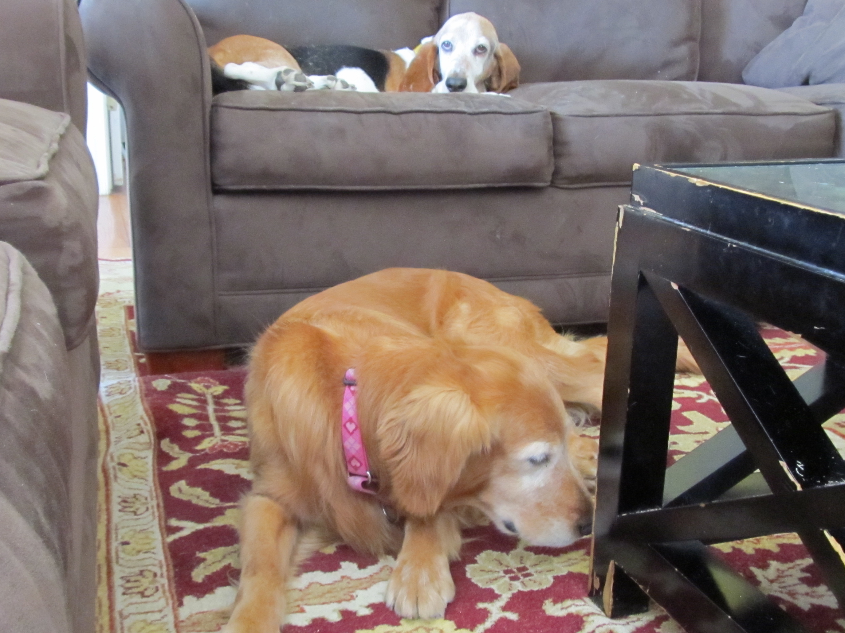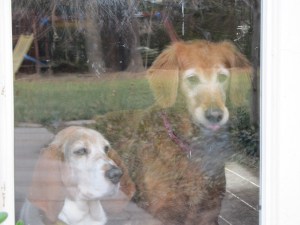 At home that night, the newly named Cassie (Clay’s choice) went through the usual struggle to settle down in a new environment, pacing incessantly, unsure of where to sleep, how to get outside when needed, what do with herself in general. Miles was little help, snapping at her when she tried to go under the table during dinner, chasing her in the backyard to let her know that this was his castle and he was the king, the big cheese, the head honcho, the top whoofer, lord of the realm. And she better not forget it.