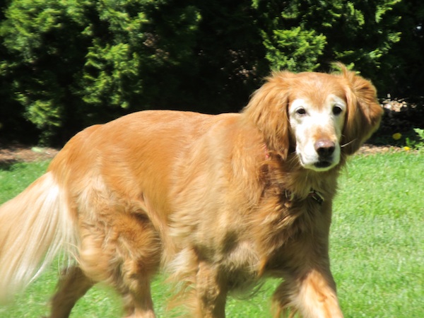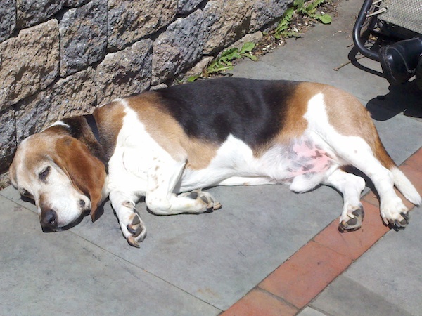 We’ve had the basset hound (Miles) we rescued for 2-1/2 years now, and the golden retriever – Clay’s Christmas present –  a year and a few months. Miles, who at first would pee two feet from the back door rather than spend time in the back yard, is now fully settled in, happily sunning himself like a fat sausage on the patio on lazy afternoons. (See below) He still takes awhile to warm up to visitors. The golden – Cassie – had a further journey after spending seven years in a rabbit cage, but is making progress. She still hasn’t wagged her tail, and probably never will, but it is a joy to see her romping in the back yard like a puppy, rolling on her back. Early on, we could never catch her asleep. She was on constant alert – spooked by the slightest noise – and often left the room when Clay entered. Now, we occasionally find her accepting Clay’s touch or stretched out on a comforter left on the floor by the little fellow, quietly dreaming. Little bits of progress all around.