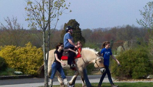 Cowboy Clay continues his love of horseback riding. On Wednesday afternoons, you can find him at Special Equestrians (above) roaming their fields. On Saturday mornings, he is at Rainbow Ridge Farm, circling the corral. Through many months of work, he is mounting more smoothly with a boost, and holding the reins – most of the time. (When they trot his arms shoot out in excitement and all bets are off.) Dismounting remains a three-person effort. He has learned to lean forward, then slide off sideways. The concept of letting his feet fall first has not clicked, yet, though, so he tends to let himself drop into the arms of whoever is there to catch him. He’s a trusting soul.