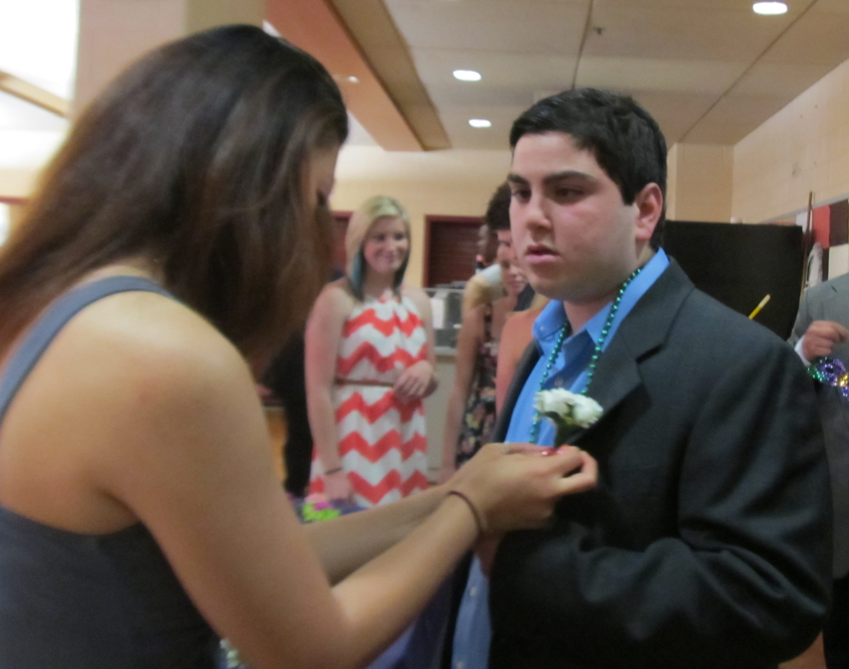 Going all nonchalant while getting a buttoniere and beads from a pretty high school volunteer.