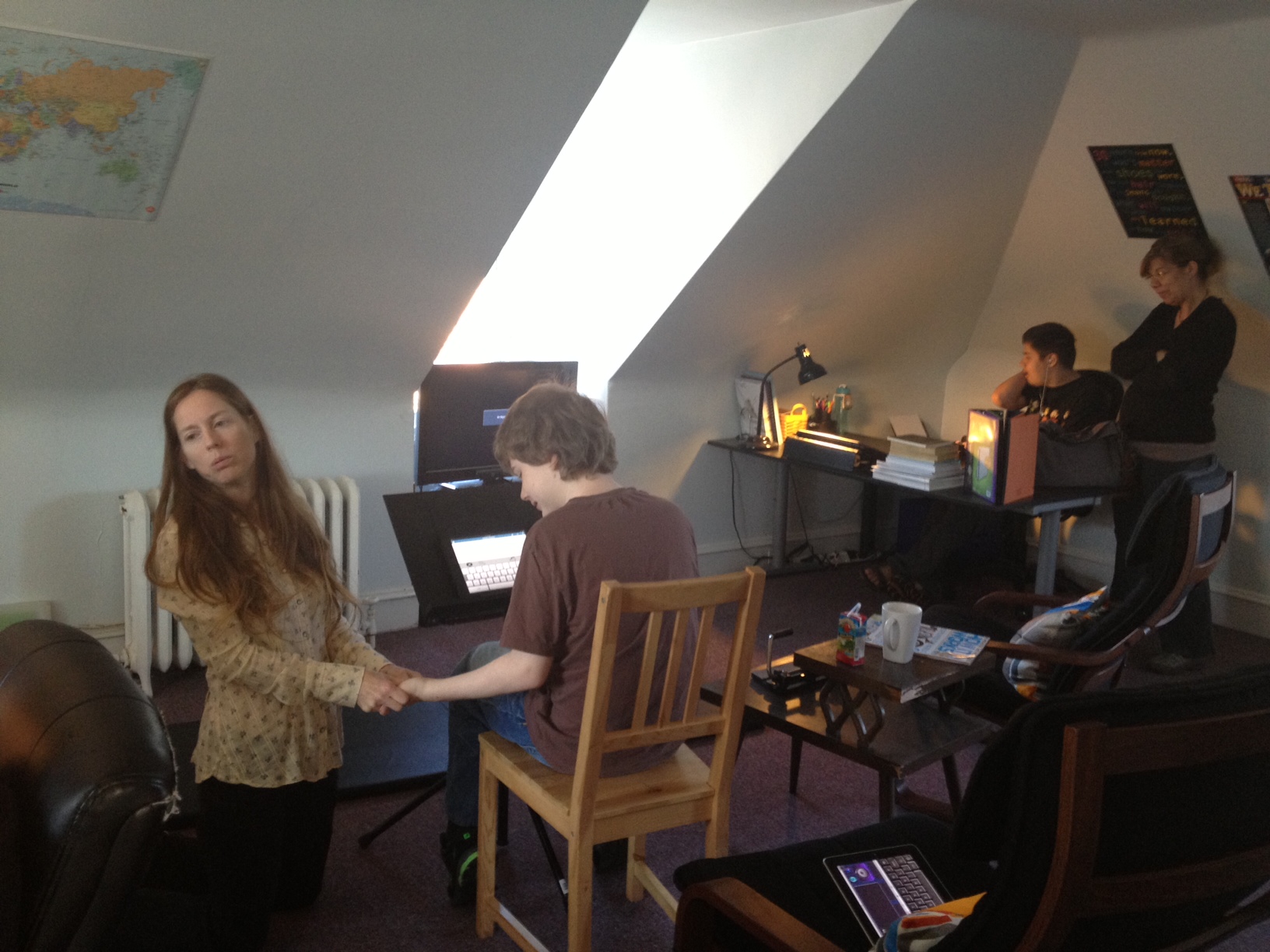 Clay enjoys being in the car, so the distance is not an issue. We pop in a favorite CD (today, he chooses a mix of Hawaiian music) and before we know it arrive to meet Michael, who is a year younger than Clay; Colin, whom we already know; and another boy named Michael, who is interested in exploring supported typing.