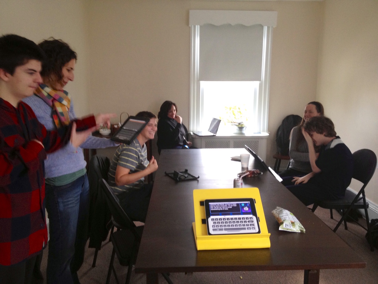 “hello buddies get me out of here,” he types, and then bolts for the stairs. Clay spends much of the time in the second-floor bathroom, where it is small and quiet. I coax him upstairs a few times, but it’s clear he needs this first Saturday Social to acclimate.